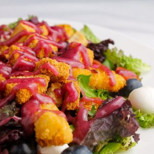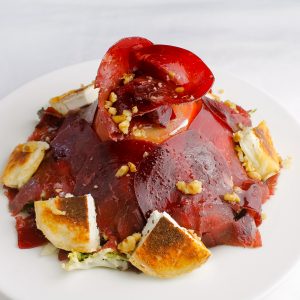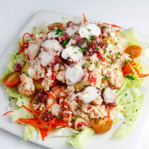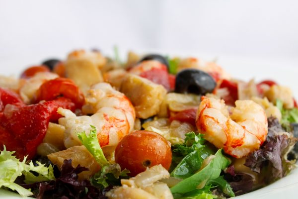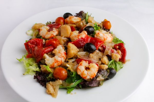 Ensalada de bacalao, gambas y pimientos asados