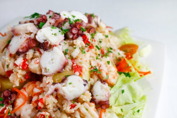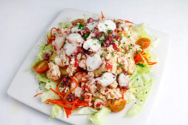 Ensalada templada de patata, pulpo y gambas